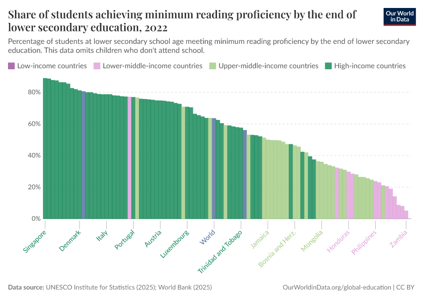 UNESCO Institute for Statistics (2025) – with minor processing by Our World in Data. “Share of students achieving minimum reading proficiency by the end of lower secondary education” [dataset]. UNESCO Institute for Statistics, “UNESCO Institute for Statistics (UIS) - Education” [original data]. Retrieved March 12, 2026 from https://bespoke-income-plots.owid.pages.dev/grapher/share-of-students-at-end-of-lower-secondary-education-with-minimum-reading-proficiency