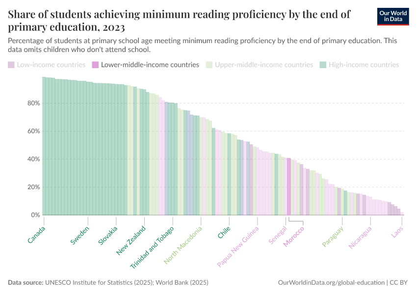 UNESCO Institute for Statistics (2025) – with minor processing by Our World in Data. “Share of students achieving minimum reading proficiency by the end of primary education” [dataset]. UNESCO Institute for Statistics, “UNESCO Institute for Statistics (UIS) - Education” [original data]. Retrieved March 12, 2026 from https://bespoke-income-plots.owid.pages.dev/grapher/share-of-students-at-end-of-primary-education-achieving-minimum-reading-proficiency