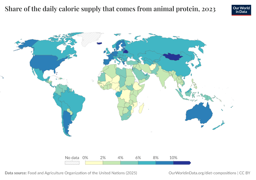 “Data Page: Share of the daily calorie supply that comes from animal protein”, part of the following publication: Hannah Ritchie, Pablo Rosado, and Max Roser (2023) - “Agricultural Production”. Data adapted from Food and Agriculture Organization of the United Nations. Retrieved from https://bespoke-income-plots.owid.pages.dev/grapher/share-of-the-daily-calorie-supply-that-comes-from-animal-protein [online resource]How to cite this data