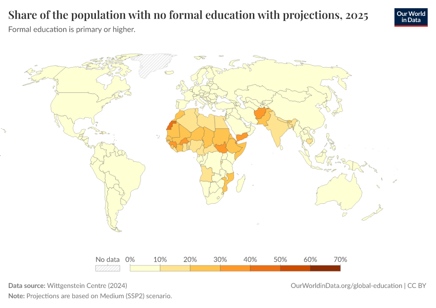 “Data Page: Share of the population with no formal education with projections”, part of the following publication: Hannah Ritchie, Veronika Samborska, Esteban Ortiz-Ospina, and Max Roser (2023) - “Global Education”. Data adapted from Wittgenstein Centre. Retrieved from https://bespoke-income-plots.owid.pages.dev/grapher/share-of-the-population-with-no-formal-education-with-projections [online resource]How to cite this data