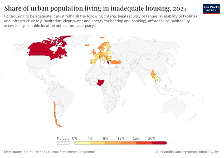 “Data Page: Share of urban population living in inadequate housing”. Our World in Data (2026). Data adapted from United Nations Human Settlements Programme. Retrieved from https://bespoke-income-plots.owid.pages.dev/grapher/share-of-urban-population-living-in-inadequate-housing [online resource]How to cite this data