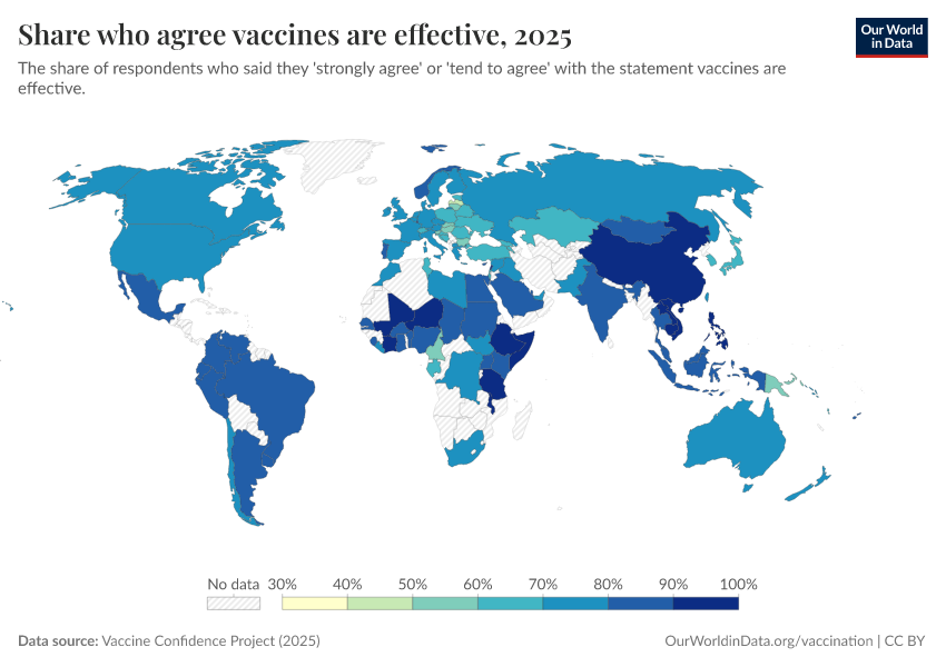 Vaccine Confidence Project (2025) – processed by Our World in Data. “Share who agree vaccines are effective” [dataset]. Vaccine Confidence Project, “Vaccine Confidence Index” [original data]. Retrieved March 12, 2026 from https://bespoke-income-plots.owid.pages.dev/grapher/share-who-agree-vaccines-are-effective