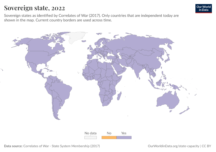 “Data Page: Sovereign state”, part of the following publication: Bastian Herre and Pablo Arriagada (2023) - “State Capacity”. Data adapted from Correlates of War. Retrieved from https://bespoke-income-plots.owid.pages.dev/grapher/sovereign-state-cow [online resource]How to cite this data