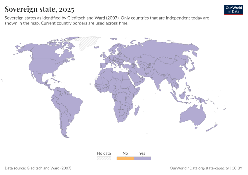 “Data Page: Sovereign state”, part of the following publication: Bastian Herre and Pablo Arriagada (2023) - “State Capacity”. Data adapted from Gleditsch and Ward. Retrieved from https://bespoke-income-plots.owid.pages.dev/grapher/sovereign-state-gleditsch-ward [online resource]How to cite this data