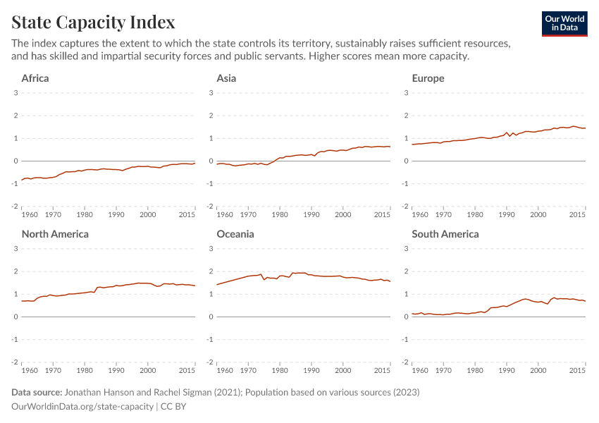 “Data Page: State Capacity Index”, part of the following publication: Bastian Herre and Pablo Arriagada (2023) - “State Capacity”. Data adapted from Jonathan Hanson and Rachel Sigman, Various sources. Retrieved from https://bespoke-income-plots.owid.pages.dev/grapher/state-capacity-index [online resource]How to cite this data