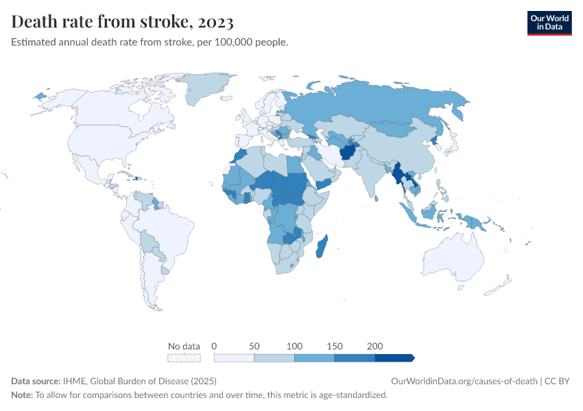 IHME, Global Burden of Disease (2025) – with major processing by Our World in Data. “Death rate from stroke” [dataset]. IHME, Global Burden of Disease, “Global Burden of Disease - Deaths” [original data]. Retrieved March 12, 2026 from https://bespoke-income-plots.owid.pages.dev/grapher/stroke-death-rates