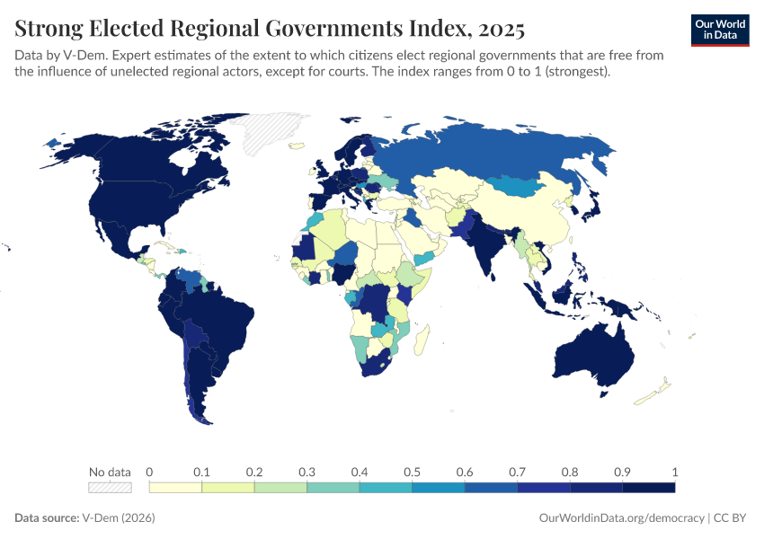 “Data Page: Elected regional governments”, part of the following publication: Bastian Herre, Lucas Rodés-Guirao, and Esteban Ortiz-Ospina (2013) - “Democracy”. Data adapted from V-Dem. Retrieved from https://bespoke-income-plots.owid.pages.dev/grapher/strong-elected-regional-governments-index [online resource]How to cite this data