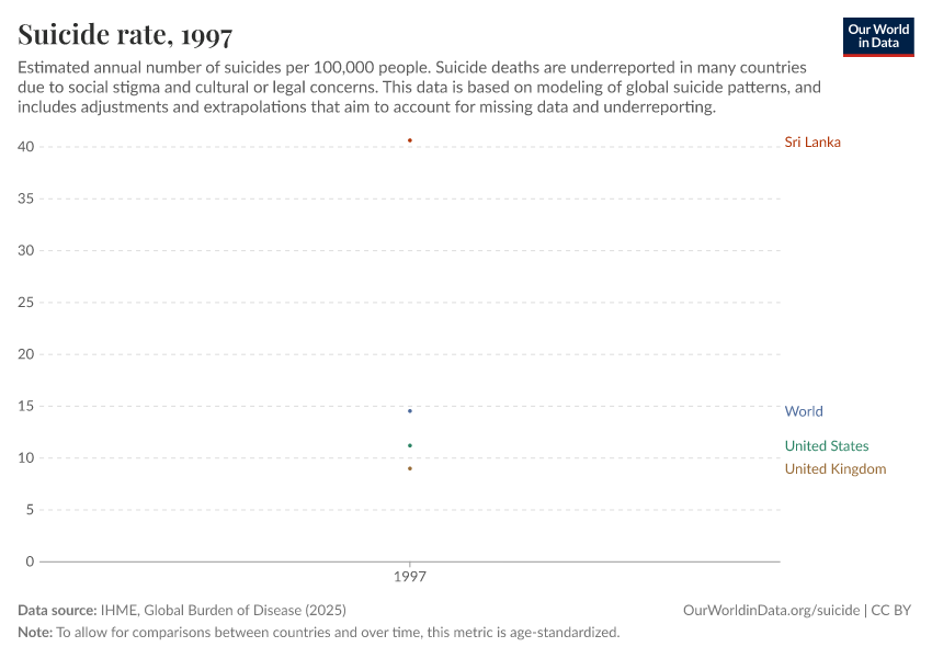 IHME, Global Burden of Disease (2025) – with major processing by Our World in Data. “Suicide rate” [dataset]. IHME, Global Burden of Disease, “Global Burden of Disease - Deaths” [original data]. Retrieved March 12, 2026 from https://bespoke-income-plots.owid.pages.dev/grapher/suicide-death-rates