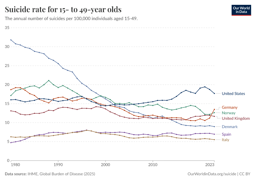 IHME, Global Burden of Disease (2025) – with major processing by Our World in Data. “Suicide rate for 15- to 49-year olds” [dataset]. IHME, Global Burden of Disease, “Global Burden of Disease - Deaths” [original data]. Retrieved March 12, 2026 from https://bespoke-income-plots.owid.pages.dev/grapher/suicide-rate-for-15--to-49-year-olds