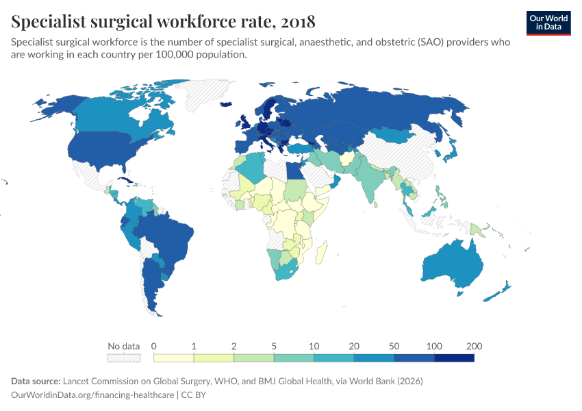 Lancet Commission on Global Surgery, WHO, and BMJ Global Health, via World Bank (2026) – processed by Our World in Data. “Specialist surgical workforce rate” [dataset]. Lancet Commission on Global Surgery, WHO, and BMJ Global Health, via World Bank, “World Development Indicators 125” [original data]. Retrieved March 12, 2026 from https://bespoke-income-plots.owid.pages.dev/grapher/surgeons-per-100000