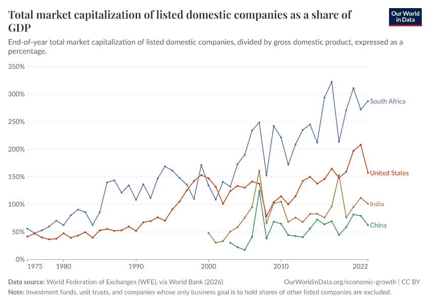 “Data Page: Total market capitalization of listed domestic companies as a share of GDP”. Our World in Data (2026). Data adapted from World Federation of Exchanges (WFE), via World Bank. Retrieved from https://bespoke-income-plots.owid.pages.dev/grapher/total-market-capitalization-listed-domestic-companies-share-gdp [online resource]How to cite this data