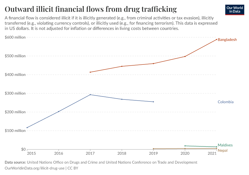 United Nations Office on Drugs and Crime and United Nations Conference on Trade and Development – processed by Our World in Data. “Outward illicit financial flows from drug trafficking” [dataset]. United Nations Office on Drugs and Crime and United Nations Conference on Trade and Development, “Data from multiple sources” [original data]. Retrieved March 12, 2026 from https://bespoke-income-plots.owid.pages.dev/grapher/total-outward-financial-flows-from-drug-trafficking
