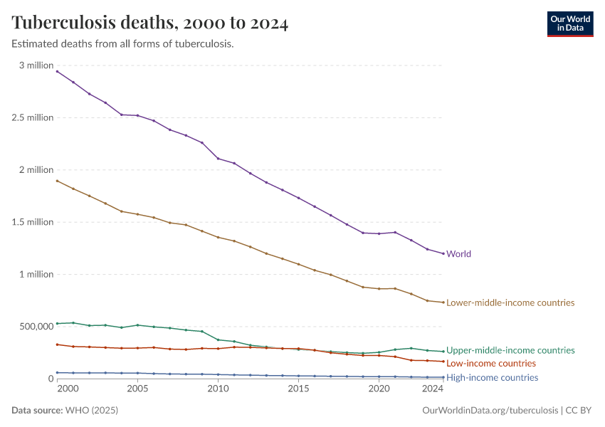 WHO (2025) – with minor processing by Our World in Data. “Tuberculosis deaths” [dataset]. WHO, “Global Tuberculosis Report - Burden Estimates” [original data]. Retrieved March 12, 2026 from https://bespoke-income-plots.owid.pages.dev/grapher/tuberculosis-deaths-who