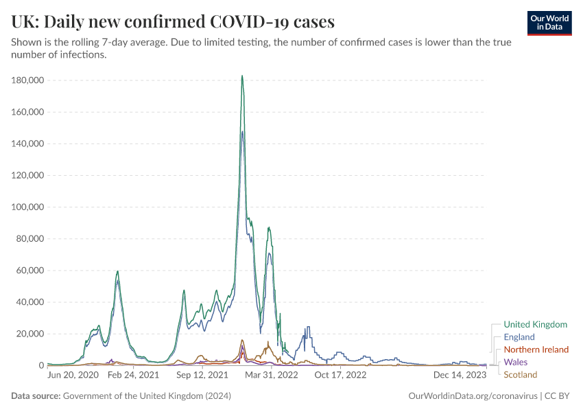 Government of the United Kingdom (2024) – with minor processing by Our World in Data. “UK: Daily new confirmed COVID-19 cases” [dataset]. Government of the United Kingdom, “UKHSA data dashboard” [original data]. Retrieved March 12, 2026 from https://bespoke-income-plots.owid.pages.dev/grapher/uk-daily-new-covid-cases