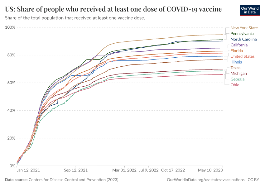 “Data Page: US: Share of people who received at least one dose of COVID-19 vaccine”, part of the following publication: Edouard Mathieu, Hannah Ritchie, Lucas Rodés-Guirao, Cameron Appel, Daniel Gavrilov, Charlie Giattino, Joe Hasell, Bobbie Macdonald, Saloni Dattani, Diana Beltekian, Esteban Ortiz-Ospina, and Max Roser (2020) - “COVID-19 Pandemic”. Data adapted from Centers for Disease Control and Prevention. Retrieved from https://bespoke-income-plots.owid.pages.dev/grapher/us-covid-19-share-people-vaccinated [online resource]How to cite this data