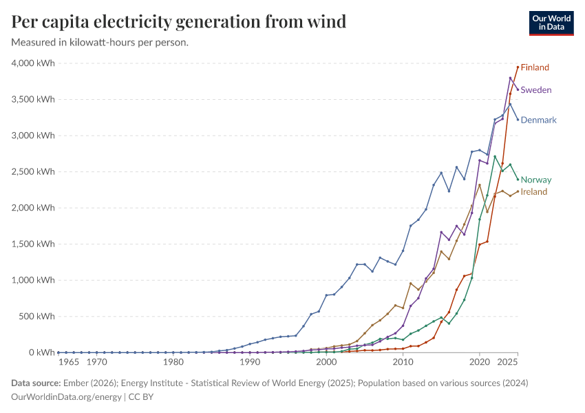 Ember (2026); Energy Institute - Statistical Review of World Energy (2025); Population based on various sources (2024) – with major processing by Our World in Data. “Electricity generation from wind power per person” [dataset]. Ember, “Yearly Electricity Data Europe”; Ember, “Yearly Electricity Data”; Energy Institute, “Statistical Review of World Energy”; Various sources, “Population” [original data]. Retrieved March 12, 2026 from https://bespoke-income-plots.owid.pages.dev/grapher/wind-electricity-per-capita