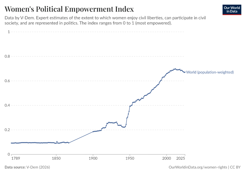 V-Dem (2025) – processed by Our World in Data. “Women's political empowerment index – V-Dem” [dataset]. V-Dem, “Democracy report v15” [original data]. Retrieved March 12, 2026 from https://bespoke-income-plots.owid.pages.dev/grapher/women-political-empowerment-index