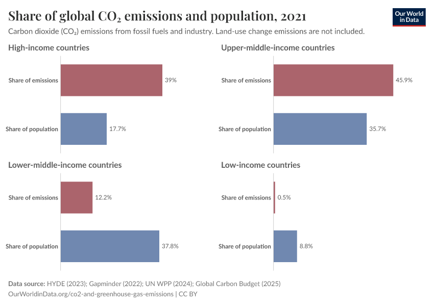 Instead, we see that high- and upper-middle income countries account for a much larger share of emissions than their population. Despite being home to just under half of the world population, they emit more than 80% of world’s CO2.
