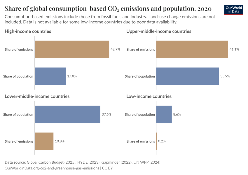 The emissions shares of lower-middle and especially low-income countries could be slightly underestimated; this is because consumption-based emissions cannot be calculated for some poorer countries due to poor data availability.