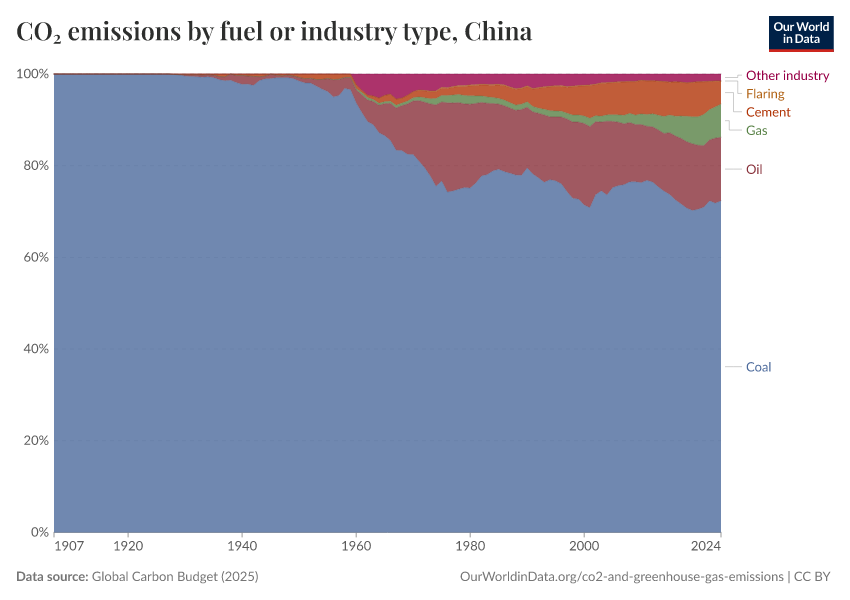 This interactive chart shows the breakdown of annual CO2 emissions by source: either coal, oil, gas, cement production or gas flaring. This breakdown is strongly influenced by the energy mix of a given country, and changes as a country shifts to or from a given energy source.