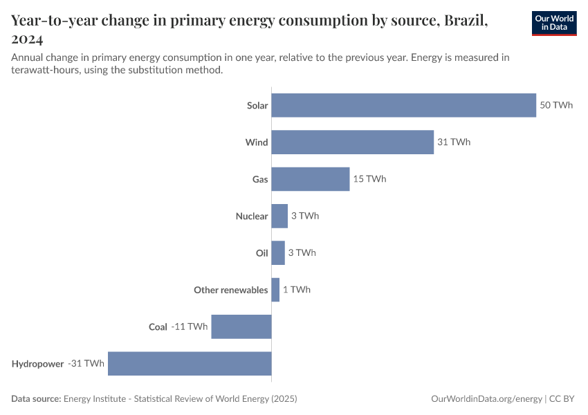 This interactive chart shows the change in primary energy consumption from these sources each year. A positive figure means the country consumed more energy from that source than the previous year; a negative means it consumed less.
