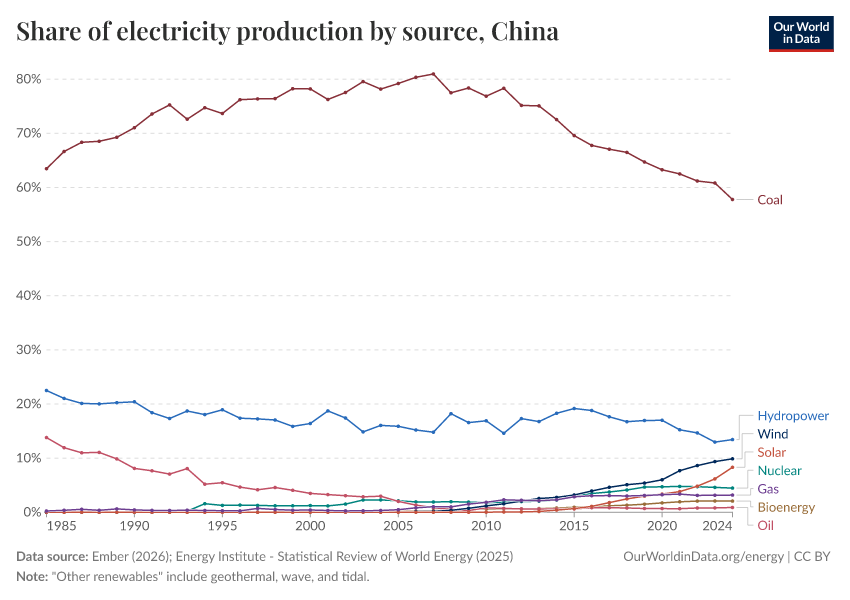 This interactive chart allows us to see the country’s progress on this. It shows the share of electricity that comes from low-carbon sources. We look at data on renewables and nuclear power separately in the sections which follow.