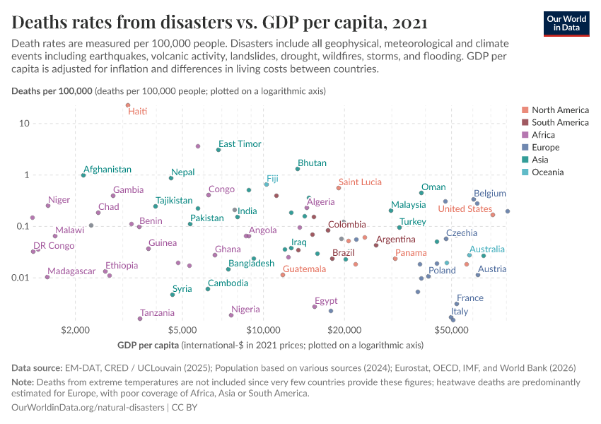 Finally, there is a lot of room for reducing vulnerabilities. Poverty makes people most vulnerable; that’s why I argue that lifting people out of poverty is an essential solution to reducing climate risks. Investing in infrastructure, making agriculture more productive, and building strong political governance are all vital. Poorer countries tend to have higher death rates from disasters, as the chart below shows. (Note that this is on a logarithmic scale.)