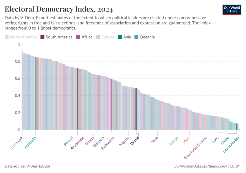 At Our World in Data we primarily use V-Dem’s Electoral Democracy Index to measure democracy.2 The index is used in all of V-Dem’s other democracy indices because V-Dem considers there to be no democracy without elections. The other aspects can therefore be thought of as measuring the quality of a democracy.