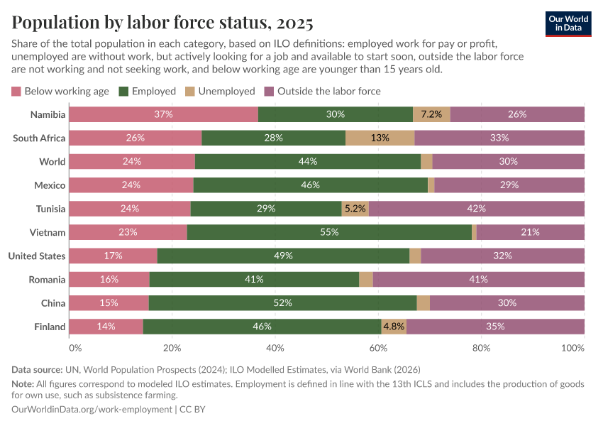 On this page, we look at these different aspects of work. We explain the key concepts and present data showing how labor market participation, unemployment, and employment are measured, and how the trends differ across countries.
